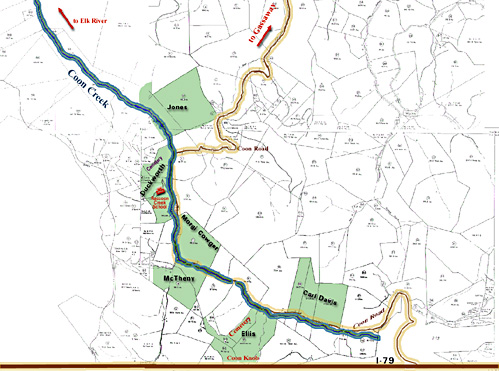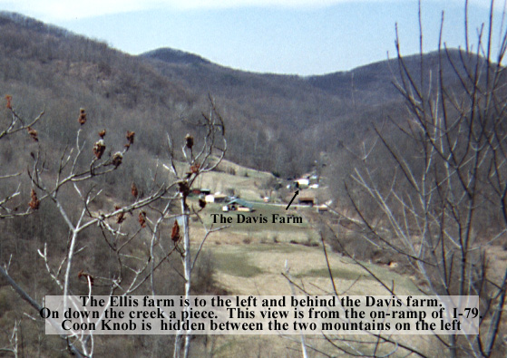 The view down twoard Coon Creek off interstate 79 - it goes around to the left behind Coon Knob. In fact, you could walk up Coon Knob by pulling off to the side of the highway. Carl Davis said he hunts coons up there and accesses the top by pulling off the side of the interstate. The interstate cuts right along Coon Knob. Coon Knob is actually not visible in this picture. There is a State Transportation shed/office here by the name of Coon Knob (right at the entrance to I-79) |