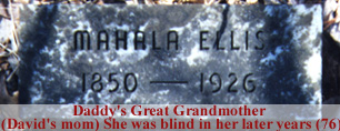Mahala Ellis was David's mother. I've heard it said that David was illegitimate and he took her name (Ellis). Carl Davis told me she went blind later in life |